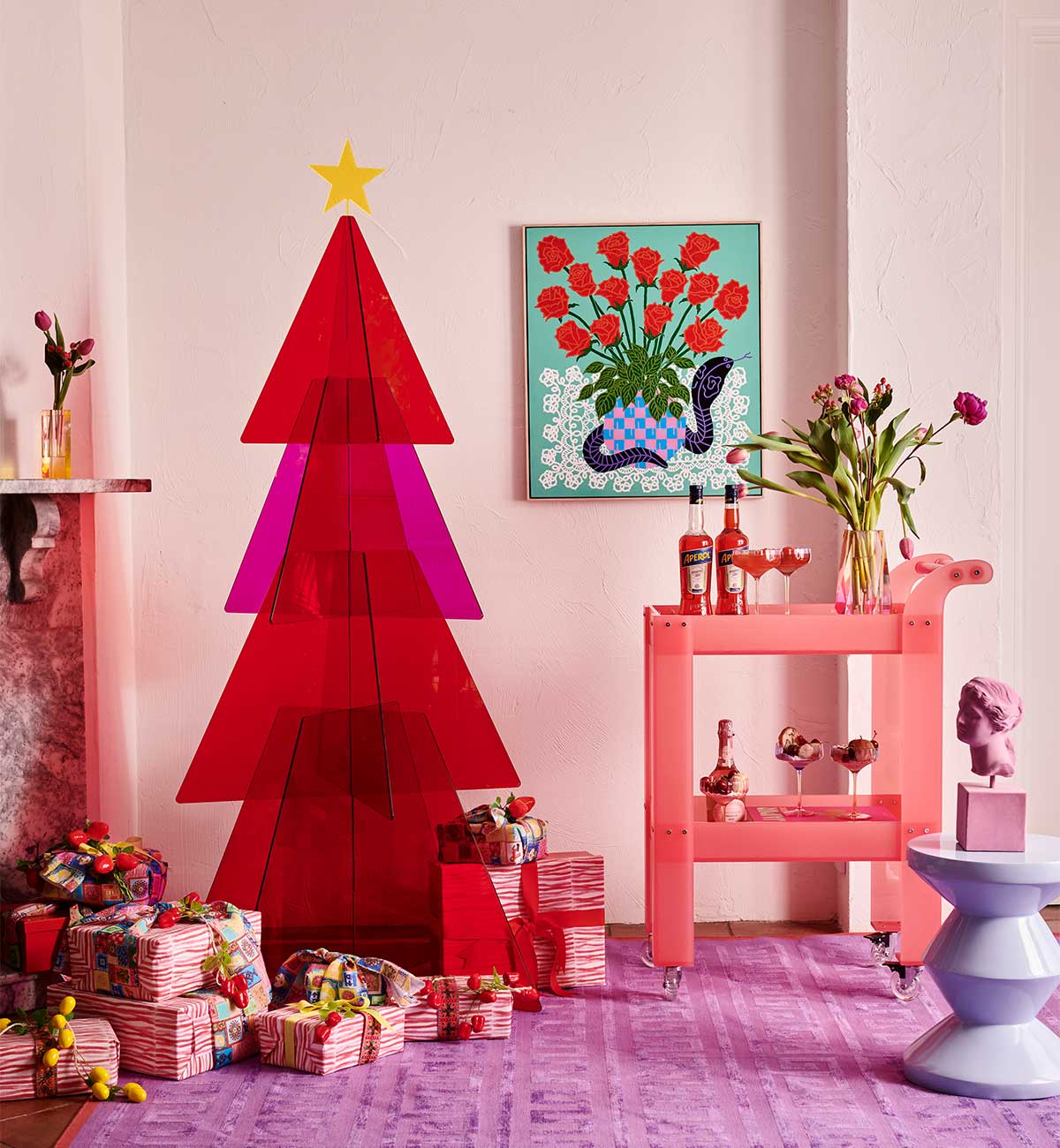 Say hello to our Pink Bar Cart. Transparent and glasslike, the barbie-pink hue and contemporary design is made from formed acrylic.