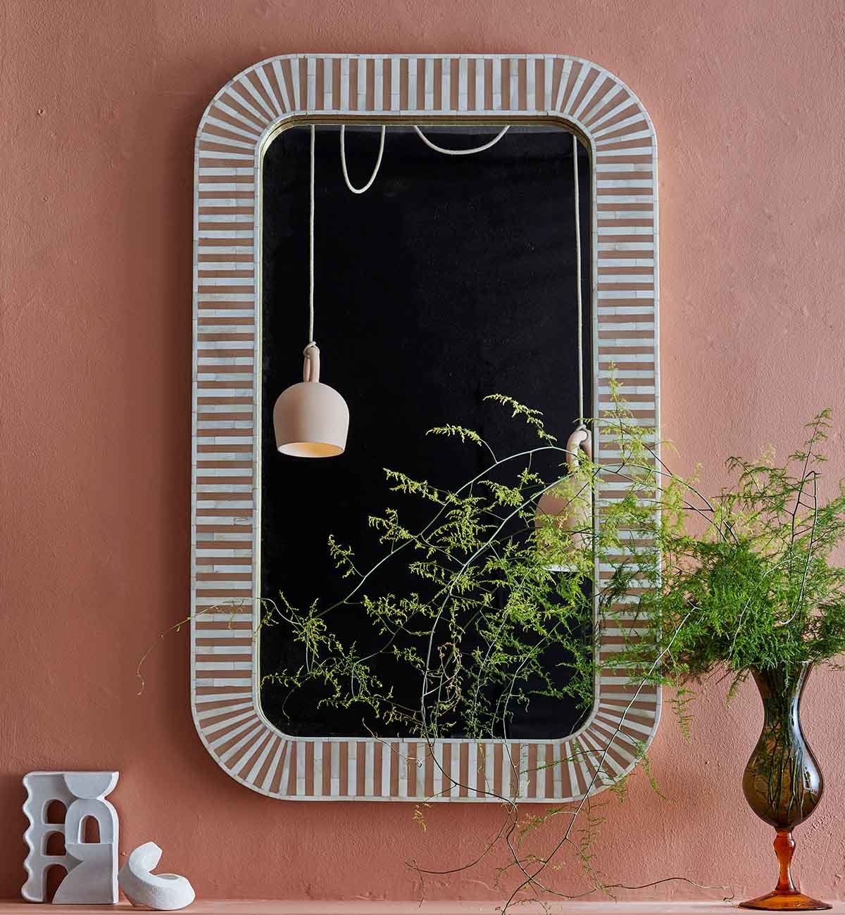 Adorn your walls with this gently curved mirror in a range of subtle hues. The soft rounded profile of the frame combined with the graphic design creates an elegant statement in bedrooms, bathrooms, above fireplaces, commodes and more.