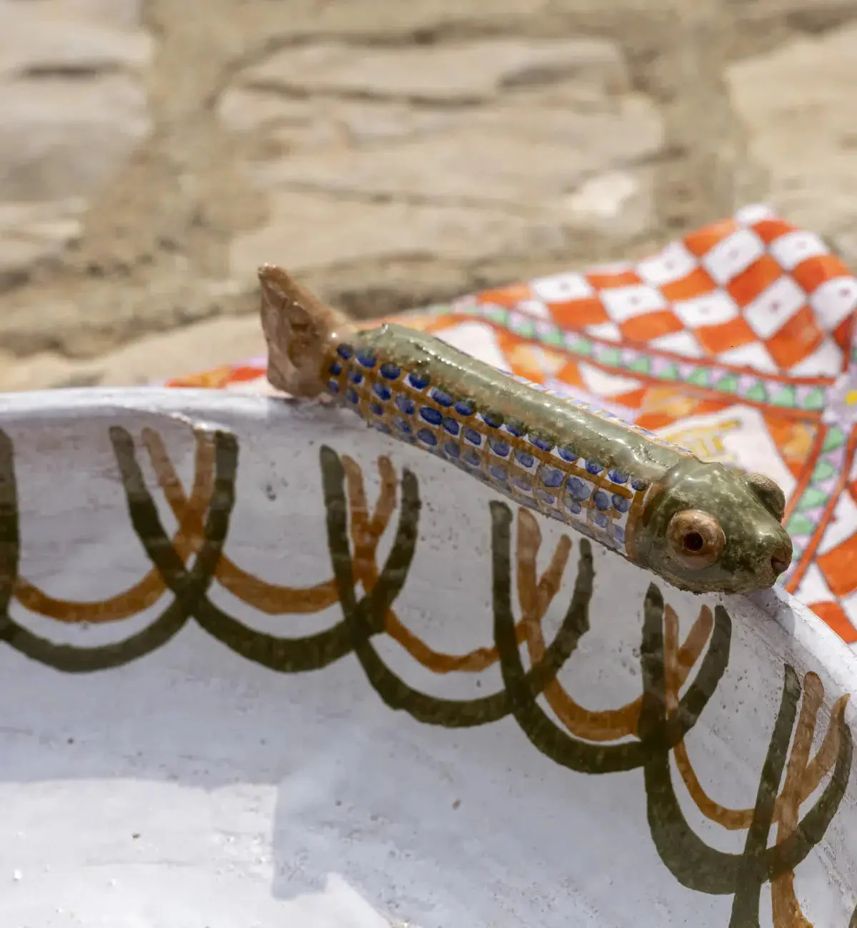 Meet 'Due Sardine Viganti' - lovingly hand-crafted, painted and glazed by Sicilian Artist Patrizia Italiano, these one-off pieces have been designed as part of our Il Mediterraneo collection. Created to encourage you to slow down, indulge the senses and share connections and experiences with loved ones. Coastal references, oceanic colour and symbols synonymous with the sea combine to create a cheerful and sunny collection, designed to transport you to carefree and barefoot days by the sea.