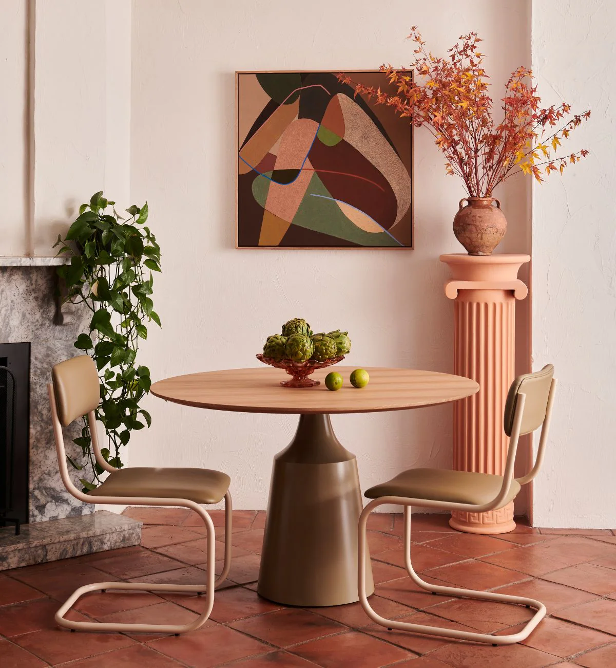 A play on shape, form and fancy details, our Soiree Dining table is both sturdy and elegant all at once. The round diameter top in crown cut oak veneer sits atop a powder coated steel base, with ample space to nestle friends around as you Soiree from breakfast into the evening.