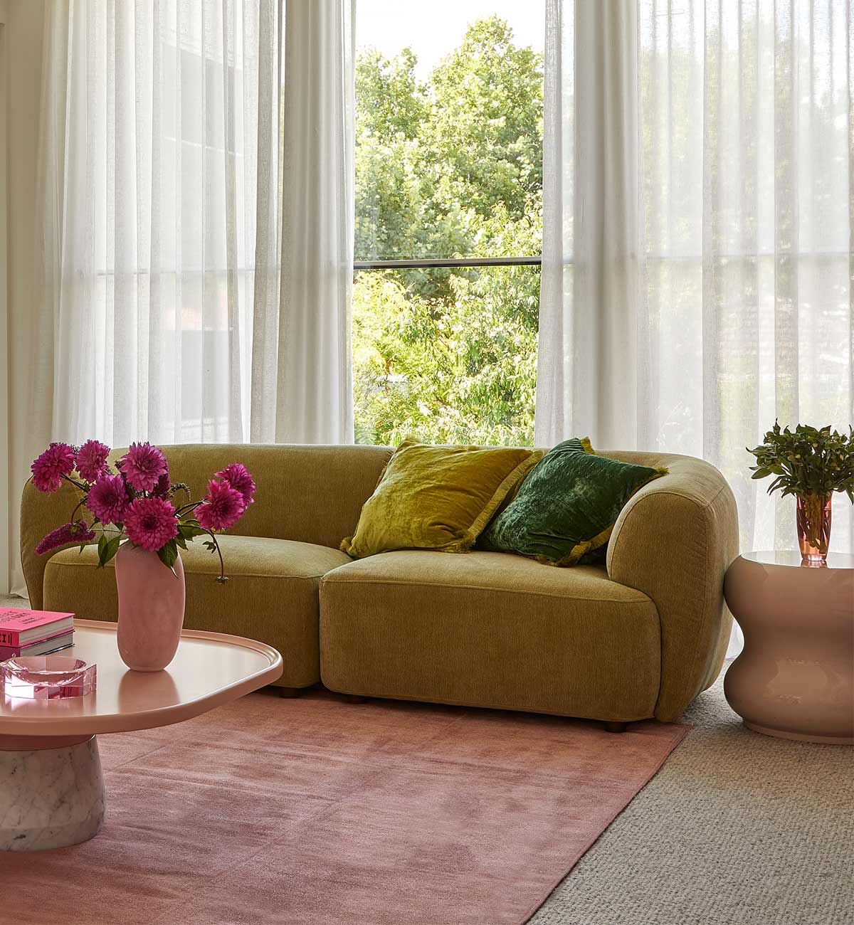 Curated with a sense of nostalgia, the blend of warmly hued tones, rich texture, luxe embellishments and bold shapes intend to invite year round sunshine into your space.